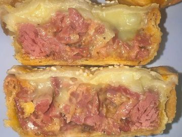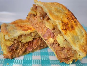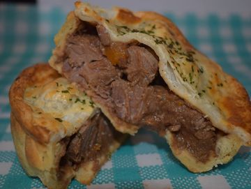12hr Smoked Silverside in a creamy sauce white creamy mashed Potato in a flaky pastry shell.