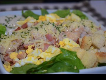 Seasoned chicken with crisp lettuce bacon egg and Parmesan with a side of croutons and Caesar dressing.