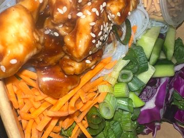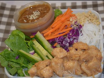 Sesame peanut chicken, vermicelli noodles, carrots, cucumber, shallots, crushed peanuts With a homemade peanut sauce.