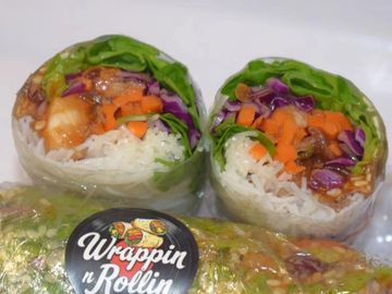 Pack of two teriyaki chicken Rice Paper Roll, includes cabbage lettuce, carrot, shallots and vermicelli noodles with a teriyaki chicken and sesame seeds. Include a dipping sauce of homemade peanut or sweet chilli.